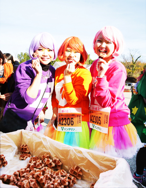 200種類以上の走っている最中でも食べやすいサイズのスイーツが食べ放題のこのイベントは毎回グループで仮装して参加する女性が多く、中にはスイーツ男子の姿も。スイーツを食べながら走るなんてできない! な〜んて事はなく、走るスピードはあなた次第。