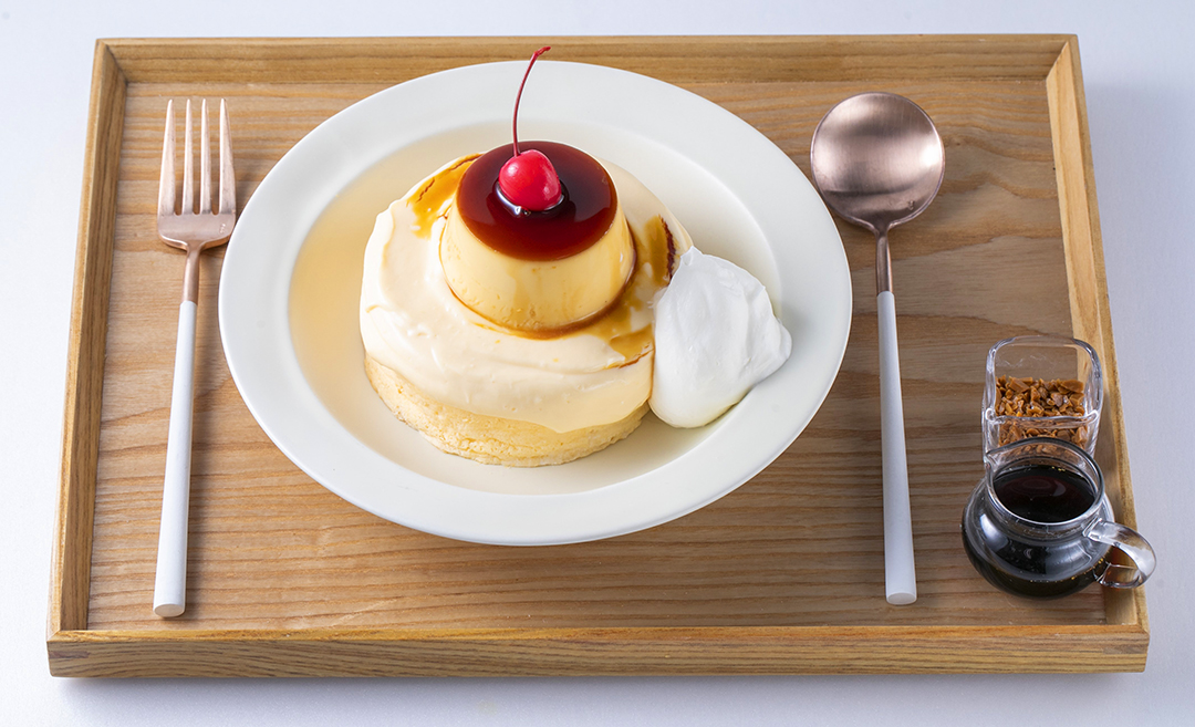 しっとりふわふわパンケーキにプリンソースをかけ、その上にプリンを丸ごとON!ふわふわのパンケーキとぷるんとしたプリンの食感が新しい組み合わせ♪
