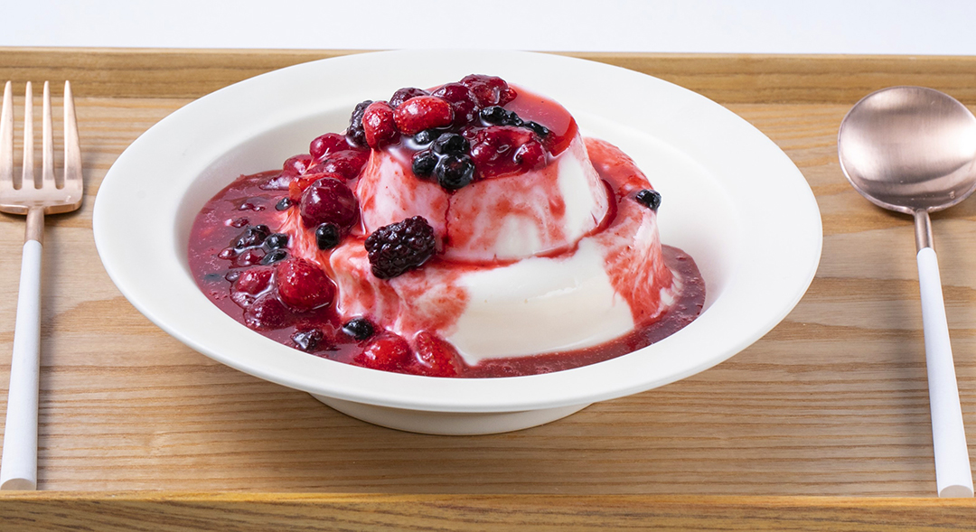 パンケーキの上に「風呂まーじゅプリン」をのせ、甘酸っぱいベリーソースをたっぷりと!
