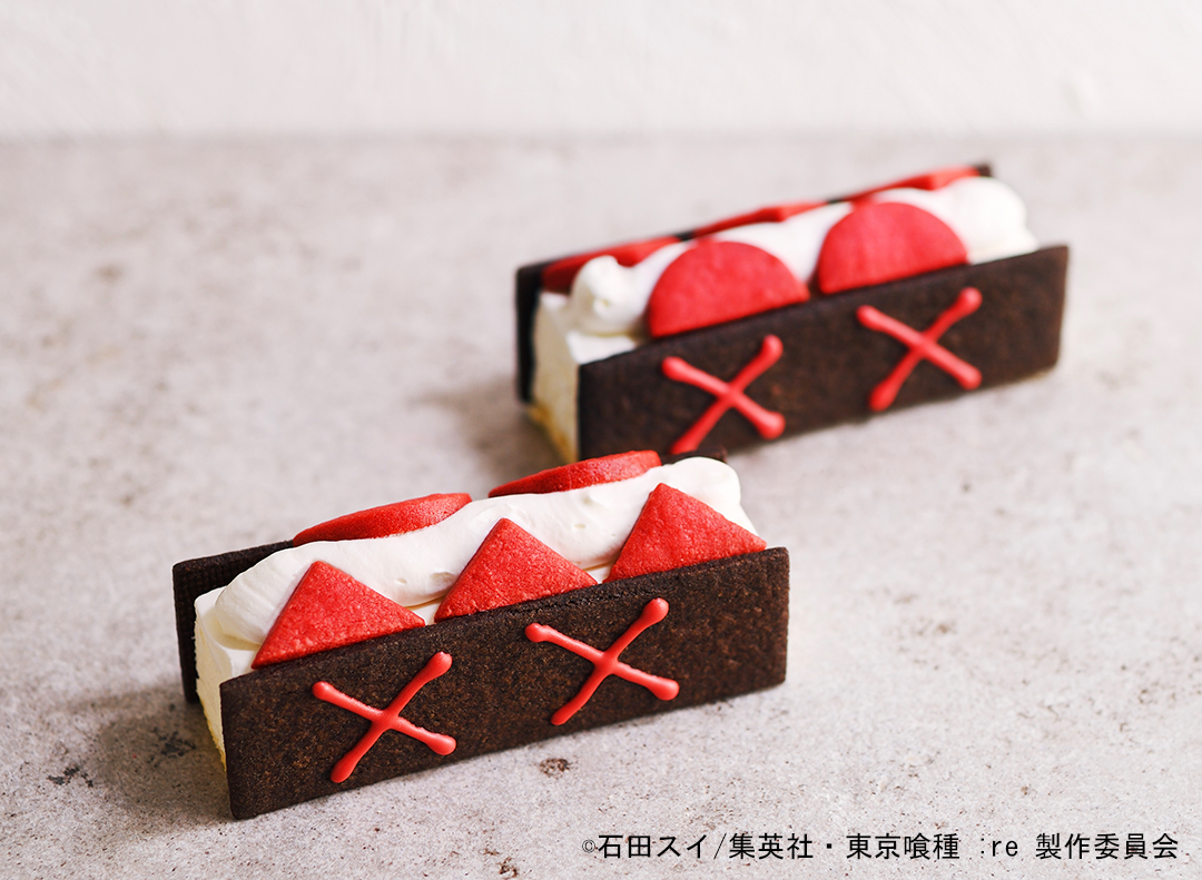 主人公「金木 研(かねき けん)」が作るケーキをイメージ。柔らかなスポンジに生クリーム、フランボワーズムース、ソースをトッピングし、赫子(かぐね)型クッキーをのせた一品。