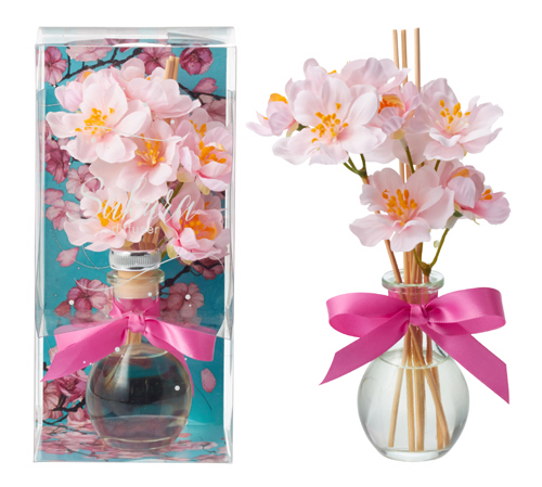 シトラスの爽やかさとスズランの香りを含む柔らかく優しい桜の香りのディフューザー。ボトルに入ったお花が見た目にも華やか。