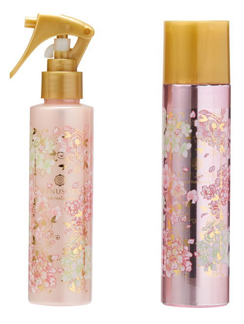 香りが長持ちするヘアフレグランスと、スタイリングやツヤ出し効果のあるスプレータイプのトリートメントグロス。ほんのり甘い桜の香り。