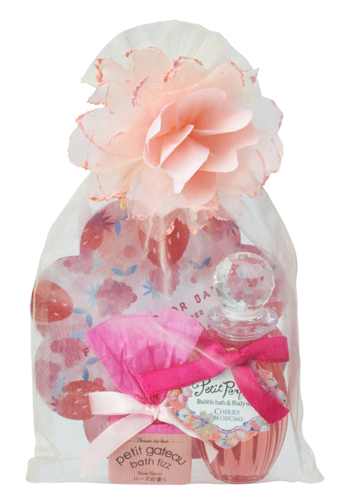 大きなお花の飾りがキュートなオーガンジーのバッグに入ったバスセット。桜の香りのバブルバス、ベリー系の香りのバスソルト、ローズの香りのバスフィズ入り。