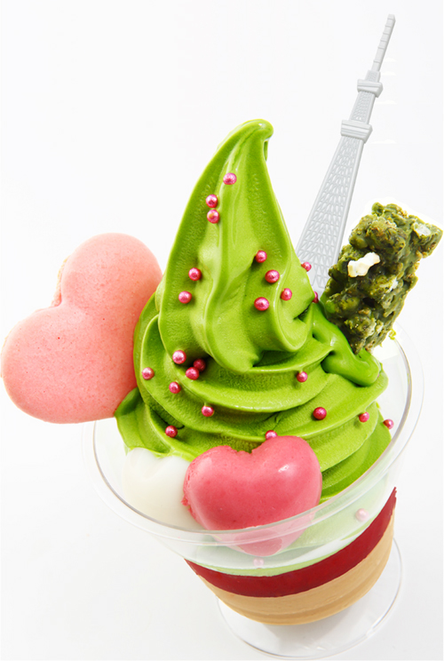 ソラマチ店限定の「バレンタインソフト」は、カップの最下層にほうじ茶のムースとラズベリーゼリーを2層にし、その上に濃厚な宇治抹茶ソフトクリームを乗せた和と洋の良さが引き立つスイーツ。さらに新商品の「がとーぶぶ 抹茶チョコクランチ」と、ピンクのマカロン、ヘーゼルナッツゼリー、ラズベリームースの3種のハートをあしらった見た目も可愛らしく仕上がっている。