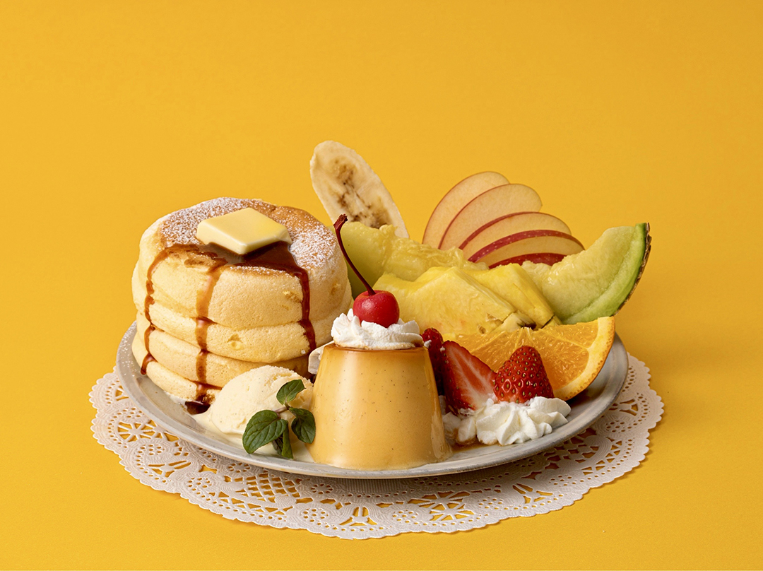 令和最初の新年にお贈りする「奇跡のパンケーキ プリンアラモード」は、毎日店舗で手仕込みするカスタードプリンを中心に、国産いちご、国産メロン、オレンジ、パイナップル、リンゴ、バナナ、さくらんぼと7種類のフレッシュフルーツ、そして自慢のスフレパンケーキを盛り付けた豪華な一皿♪