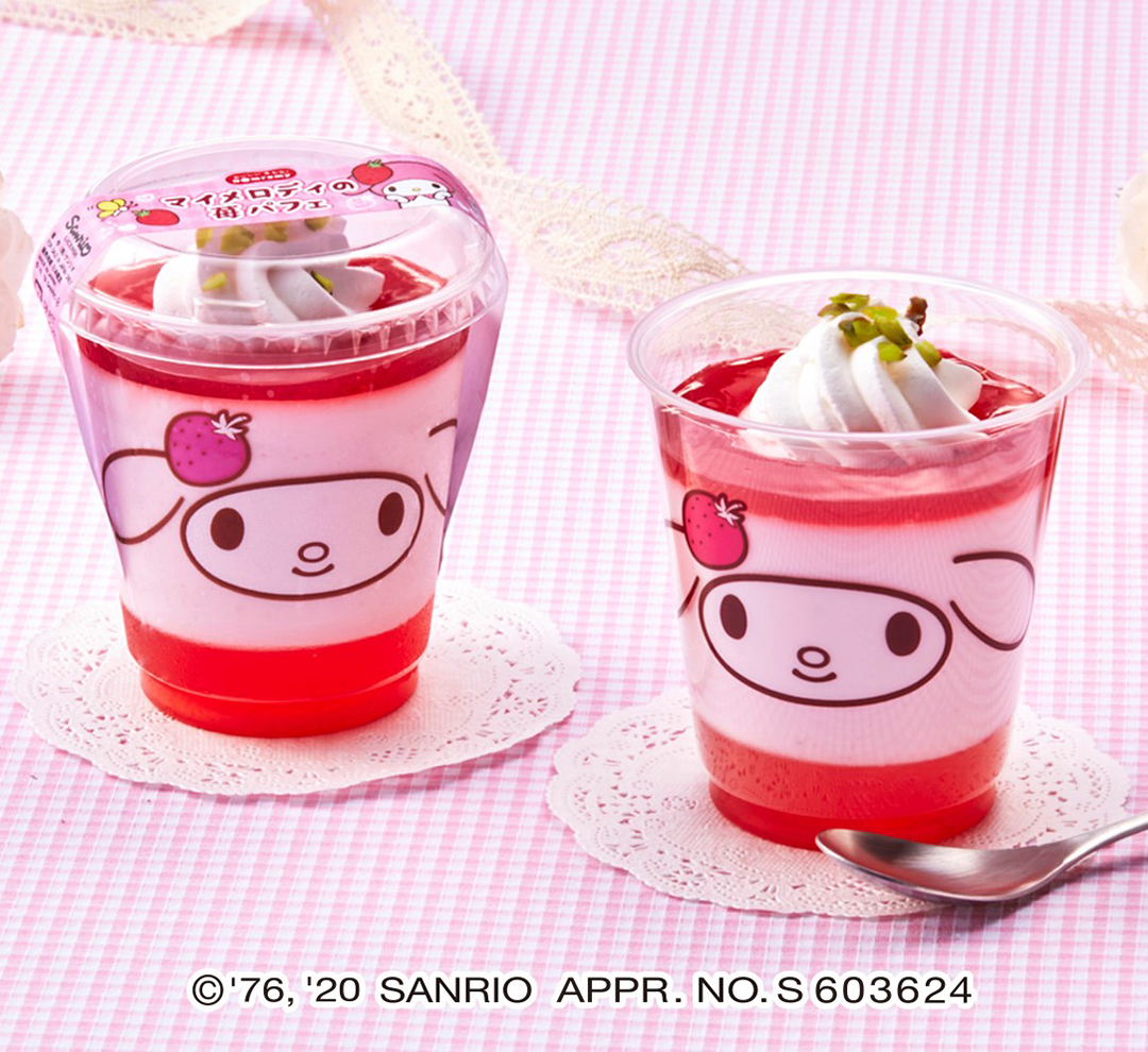 粒々苺ミルクゼリー入りの苺ミルクプリンをのせ、苺果肉入りソースや苺クッキーをトッピングした苺尽くしのアラモード。マイメロディの顔がプリントされたフィルムは3種類。色々な表情のマイメロディが楽しめる♡