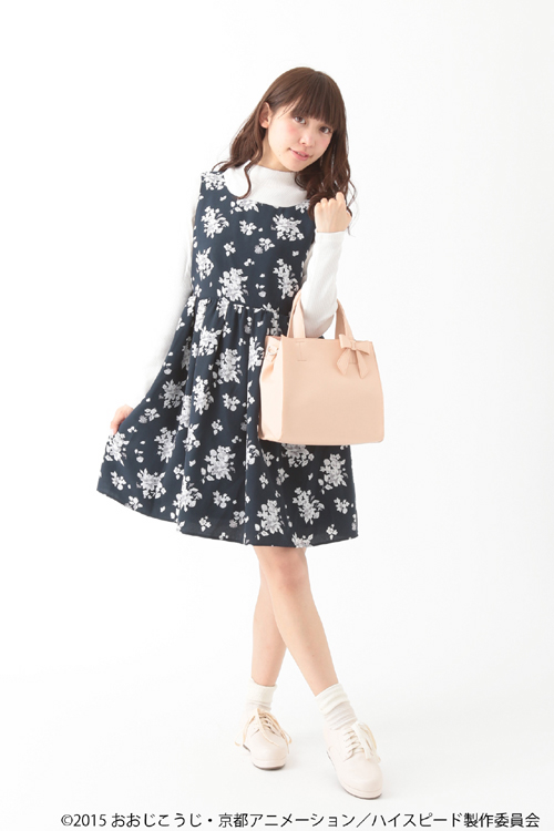 一目惚れしてしまいそうな美しいライトブルーとグレーのグラデーションのニンッとワンピースは主人公の遥をイメージ。ポケット生地はイルカが泳ぎ回るドット柄で、ベルト付きだから丈の調節も自由自在。ガーリーにもカジュアルにも着こなせて爽やかな遥をいつでも側に感じられる。