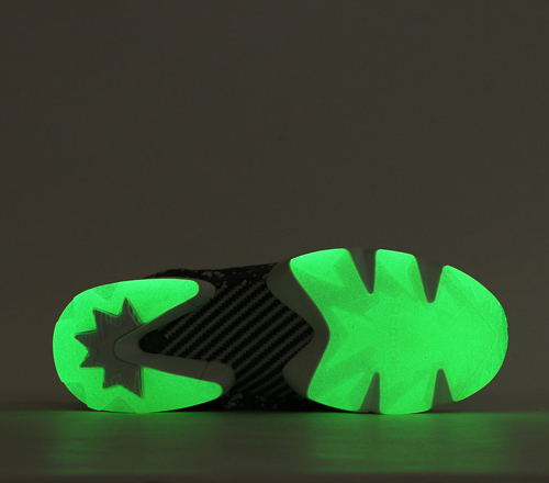 今回のコラボシューズの最大の特徴は、暗闇で光る蓄光塗料を取り入れたデザイン。
