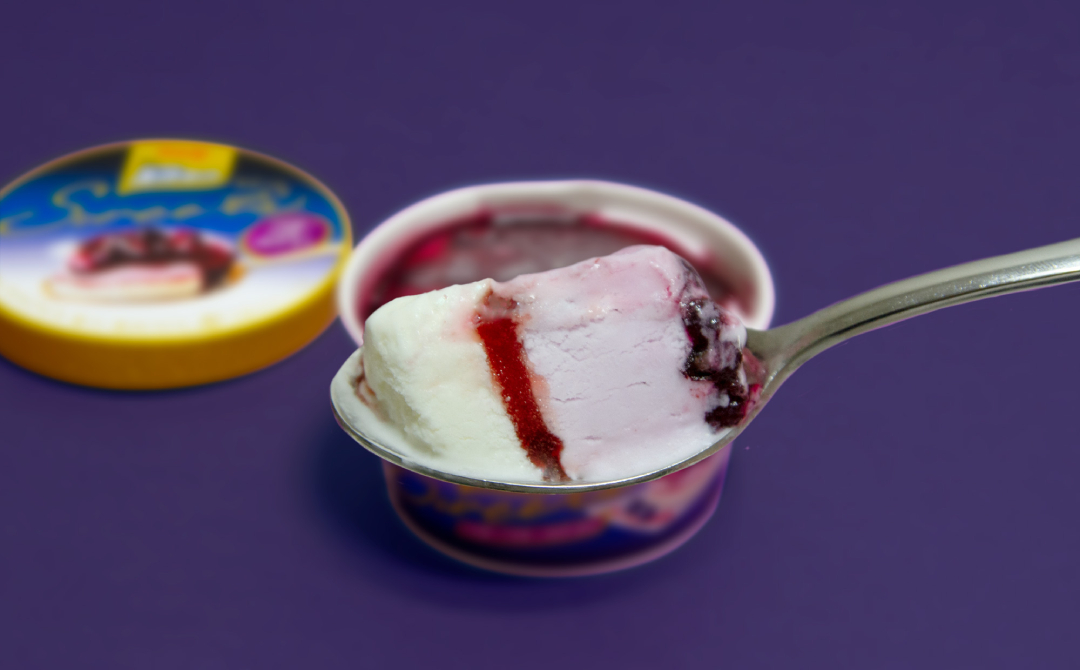 新しいパッケージでは、スプーンですくい上げたとろけるベリーソースと2種のアイスが織りなす一体感をシンプルに表現。綺麗な4層をイメージしたグラデーションカラーとゴールドで甘すぎない上品なデザインに仕上がっているんだ♪