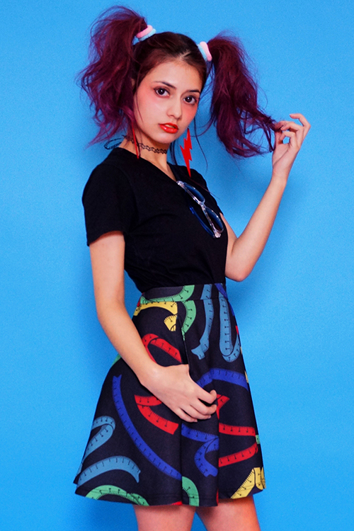 一見リボン柄に見えるスカートはメジャーであったり、幾何学柄のシャツワンピースは数字の総柄になっていたり、とことんラブリーなワンピースはラブレター柄など、どれもインパクトのあるgalaxxxyらしいグラフィックに。