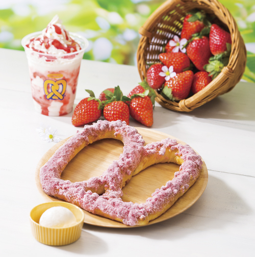 春らしい華やかな見た目の「とちおとめ練乳 プレッツェル」は、程よい甘みの蓮友をイメージしたミルク味のフレークを、プレッツェル生地にのせ、オーブンで香ばしく焼き上げ、「とちおとめ」を使用した甘酸っぱいストロベリーシュガーをトッピング。華やかな苺の味わいを見た目でも香りでもわかるプレッツェルに仕上がっている。