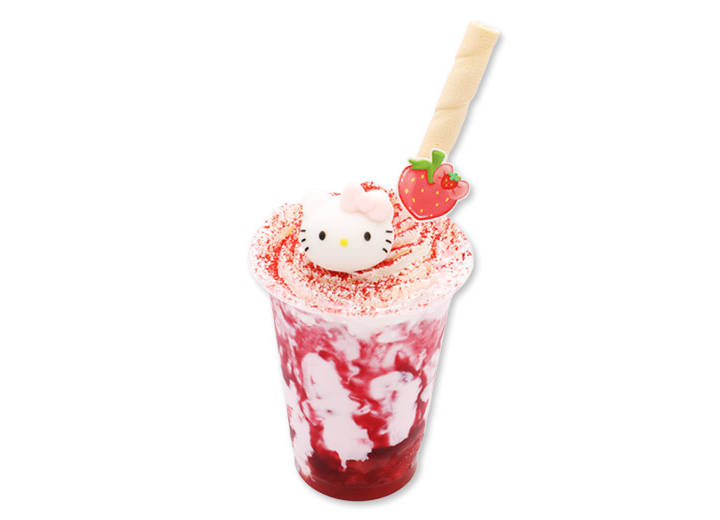 ストロベリーソースがかかったカップには、甘すぎないすっきりとしたいちごミルクの上に、ストロベリーパウダーがかかったたっぷりのホイップ!食べられるコロネクッキーストローで、いちご果肉のつぶつぶ食感も楽しんでね♪ キティマシュマロのリボンも、いちごミルクとおそろいみたい♡