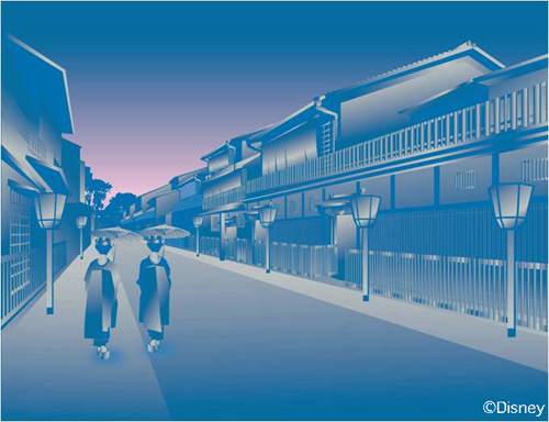また、店内も「二条城」、「渡月橋」、「花見小路」等の京都を代表する計9箇所の名所や情景がディズニーキャラクターと一緒に描かれている。京都だけのオリジナル演出になっている。