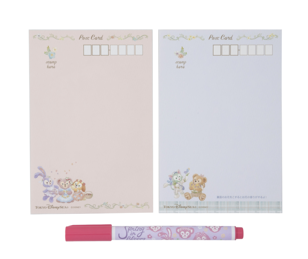 ポストカード&カラーペンのセット。ベージュのポストカードは、キャラクターデザインをこするとお花の香りがするよ!