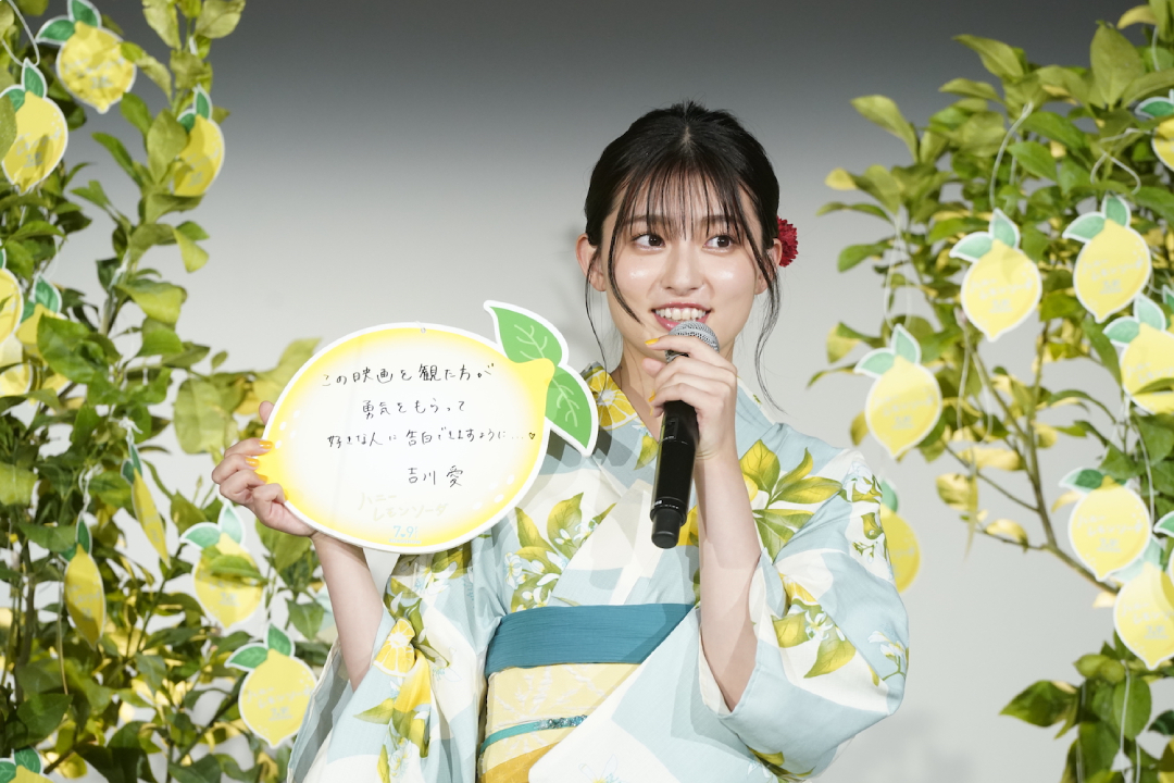 内気な⾃分から変わりたいと願うダイヤモンドガール・⽯森⽻花を演じた吉川は「こうやって皆さんにお会いすることが出来てすごく嬉しいです。コロナ禍で浴⾐を着る機会がないと思っていたので、それも嬉しいです。浴⾐も帯も、『ハニレモ』カラーを意識しました。ネイルもレモンソーダ⾊です!」 と挨拶し、2⼈とも「ハニレモ」カラーに⾝を包んで気合じゅうぶんの様⼦。