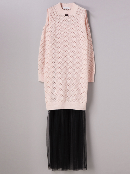 甘いイメージのクロシェ編みとブラックチュールの組み合わせが毒っけのあるガーリースタイルを演出してくれるワンピース。肩開きやチュールのシアーディテールが他にはないでデザイン。それぞれを単品としても楽しめるセットアイテム。