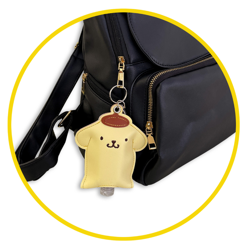 【詳細】ポムポムプリン&クロミがデザインされた、大人可愛いフェイクレザー仕様♡ 除菌ジェルをラクラク持ち運べる「レザーボトルケース」が発売中!