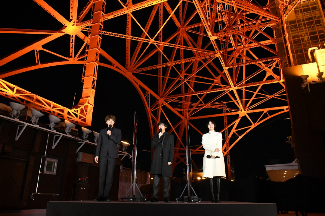 最後に、柄本は「自分の人生に絶望した男が東京の街を破壊するという映画。観終わったときには大きな希望を感じていただける作品と思っているので、それを体験しに劇場に来ていただけたら幸いです。」、池田は「新しい年が始まって、数十日経って、今年はどういう一年になるんだろうかという不安を払拭してくれるような、一見激しい映画に見えるかもしれませんが、みなさんの私心を支えるような、助太刀するような映画になっていると思います。劇場で希望を感じていただければと思います」、永瀬は「この作品がいろんな方々の目に触れる日が楽しみです。観た後に懐かしい気持ちになる方もいれば、主人公の“私“に共感する方もいると思います。観れば観るほど、『真夜中乙女戦争』という物語の世界観に酔いしれますし、十人十色の考え方で感想があると思うので、僕自身も楽しみにしています」と本作に対する想いを熱弁!久しぶりに三人揃っての集結ということで、再会を互いに喜びながら進行したイベントは、東京タワーのオレンジの光と、3人の仲良くあたたかな雰囲気に包まれながら幕を閉じた。
