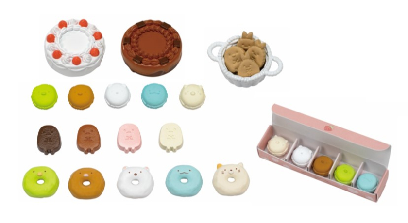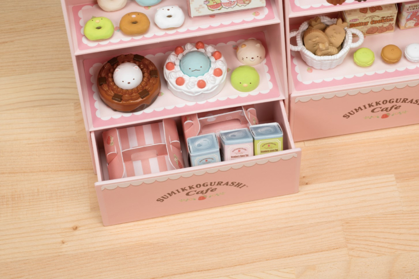 商品内容:ソファー(1)、テーブル(1)、棚(ひきだし付き)(2)、レジ(1)、ホールケーキ(2)、すみっコケーキ(5)、すみっコマカロン(5)、すみっコドーナツ(5)、たぴおかチョコレート(4)、クッキー(3種×2)(6)、ねこプリン(1)、ぺんぎん?スペシャルパフェ(1)、イチゴサンド(1)、ふろしきロールケーキ(1)、かご(1)、ティーポット(1)、シュガーポット(1)、カップ&ソーサー(2)、お皿(2)、トレイ&トング(1)、ペーパースタンド(1)、スプーン(シュガー、ティー、パフェ)(5)、フォーク(2)、本体壁(1)、せんようかみこものシート(A4シート)(3)、せんようシールシート(1)