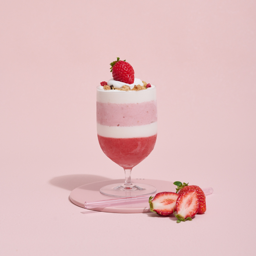 “あまおう”苺を使ったシャーベットスムージーに、ヨーグルトクリーム、ミルクを加えた"“あまおう”苺のスムージーを重ねた、4層仕立てのスムージーボンボン。一番下の“あまおう”苺のシャーベットスムージーには、アクセントにパイナップルを少しプラス。4層のスムージーとトッピングのグラノーラを一緒に混ぜて楽しんで。