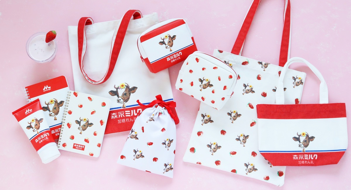 雑貨は、普段使いしやすいペンケースやノート、ポーチ、巾着、トート2種の全6型をご用意。印象的な赤いラインに愛らしい牛のキャラクター「ミルリン」がお馴染みのパッケージ柄と、春らしいイチゴ柄の2柄だよ。イチゴ柄はよく見ると、イチゴにとろりとれん乳がかかっているというこだわりも!見るたびに、あまーいれん乳がけイチゴが食べたくなるかも!?