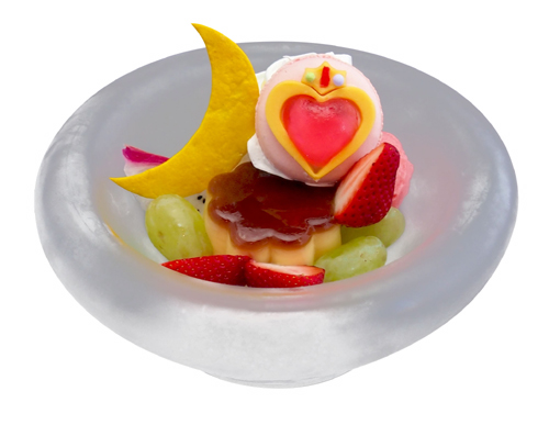 ちびうさの大好物のプリンにコンパクトと月を添えて、可愛らしいア・ラ・モードに。ドラゴンフルーツなど数種のフルーツとアイスクリームを盛りつけたフレッシュな一皿。
