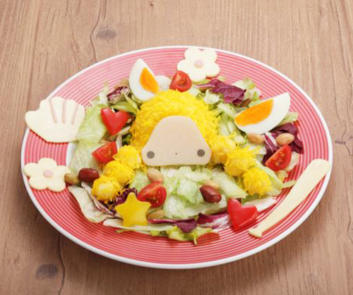 マッシュポテトに錦糸卵をまぶしたパティが、お花畑で遊んでいるようなサラダプレート。