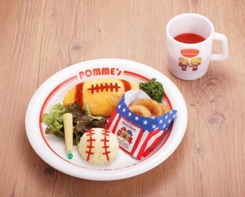 ポムの樹自慢のオムライスが、パティとジミーが大好きなスポーツグッズで変身。野球ボールのマッシュポテトとオニオンリングを一皿に集めた欲張りなワンプレート。ケチャップ、明太クリーム、トマトソース、デミチーズソースの4種類から好きなソースが選べ