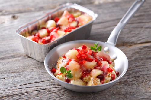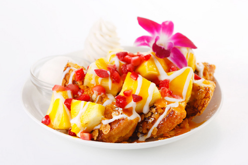 ザクザクのコーンフレークをまぶしたフレンチトーストにココナッツソースとパイナップルをたっぷりのせて、エキゾチックな一皿に仕上げたその名も「エキゾチック」。