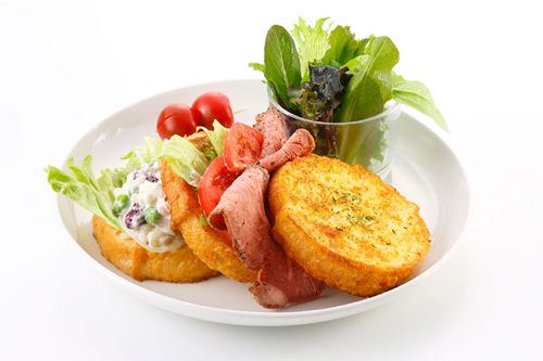 フレンチトーストを3枚も使った大満足の「パストラミビーフサンド」。ディジョンマスタードを塗ったフレンチトーストに、パストラミビーフ、トマト、キドニービーンズと枝豆を使ったポテトサラダをサンド。