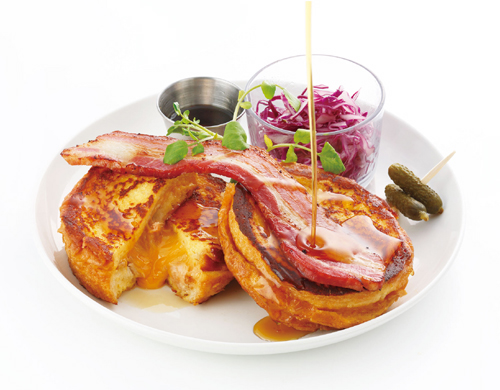 Ivorishがおススメする、アメリカンなフレンチトースト「ツナチェダー&メープル」。ツナとチェダーチーズをサンドしたフレンチトーストにメープルシロップをたっぷりかけて、旨味たっぷりのホエー豚のベーコンと一緒に食べちゃって。甘さとしょっぱさが絶妙にマッチする驚きのメニュー。