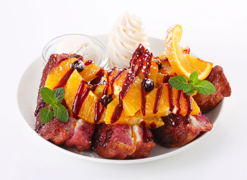 女子の定番カクテル「カシスオレンジ」をフレンチトーストに。カシスのアパレイユをつかったフレンチトーストにジューシーなオレンジとカシスの実をトッピング。カシスソースを絞り、香り豊かでちょっとオトナな一品に仕上がっている。※ソースにカシスリキュールを使用しております。※写真はレギュラーサイズ。