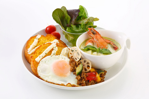 有頭エビのグリーンカレーとキーマカレー2種類のカレーが楽しめます。クリームチーズを塗ったフレンチトーストを ディップして食べると、また違う味わいに!エスニック料理が好きな方にはたまらない一皿。