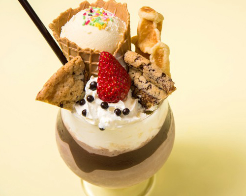 つめた〜いチョコレートシェイクにホイップクリームや、焼き菓子、ワッフルコーン入りのバニラアイスをトッピングしたまさに見た目もゴージャスな『ラグジュアリーミルクシェイク』。