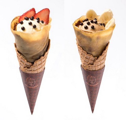 ワッフルコーンに入った見た目もかわいい食べ歩きにおすすめの『FAST MAX クレープブリュレ』はストロベリーとバナナの2種類。