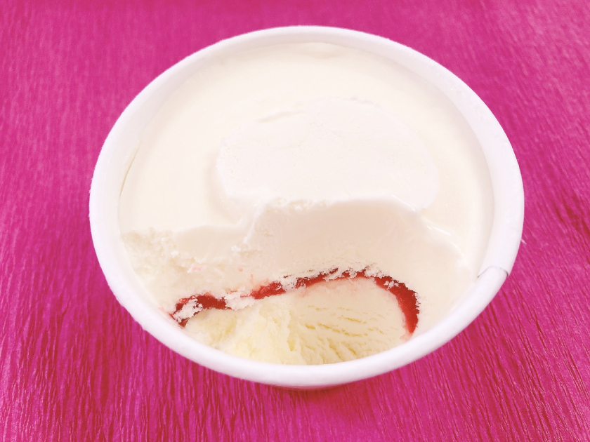 クリーミーで濃厚な味わいのフロマージュ(チーズ)と、果実感のある甘酸っぱい苺を組み合わせたアイスクリーム。 北海道産クリームチーズを使用したクリーミーでなめらかな口あたりのフロマージュアイスクリームを食べ進めると・・・。