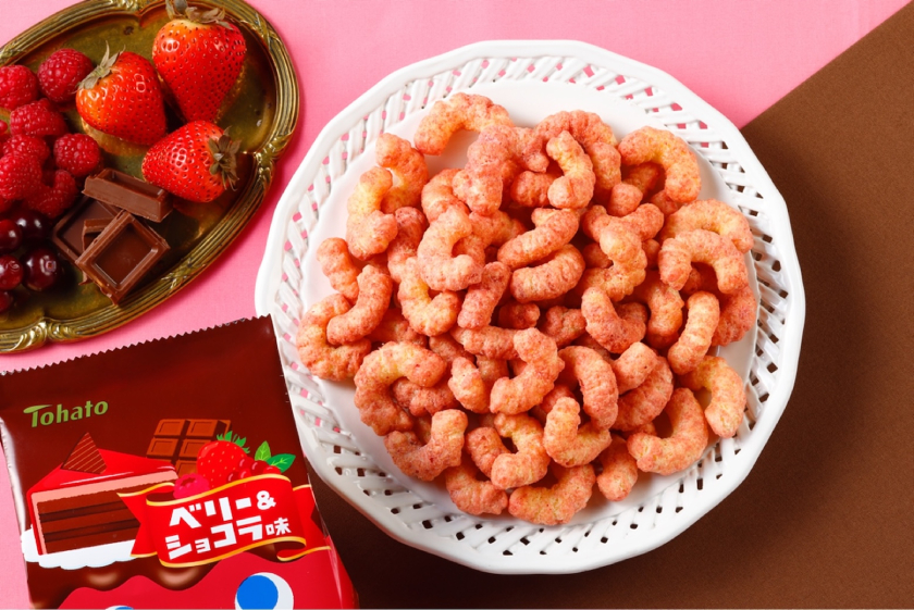 「キャラメルコーン・ベリー&ショコラ味」は、ストロベリー、ラズベリー、クランベリーの3種のベリーの酸味とチョコレートの甘さ、生クリームのミルク感のハーモニーを楽しめるよ♡
