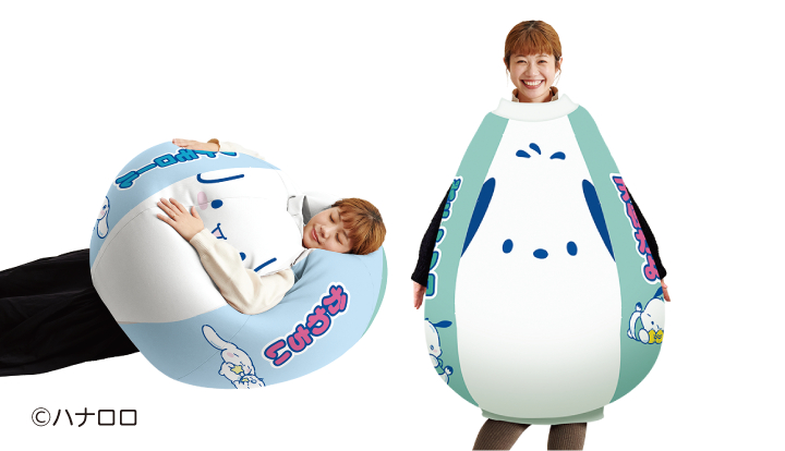 「推しを着られるビーズクッション」は、シナモロールとポチャッコを着られる巨大ビーズクッション。サイドには推し活に関する言葉も入っているよ。