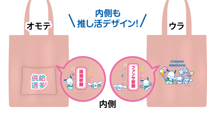 うちわが縦に入る大きめサイズのトートバッグ。外側のポケットにはぬいぐるみが入れられるよ。バッグの内側には「当選祈願」と「ファンサ祈願」のお守りがこっそり印字された、推し活にピッタリのアイテム。