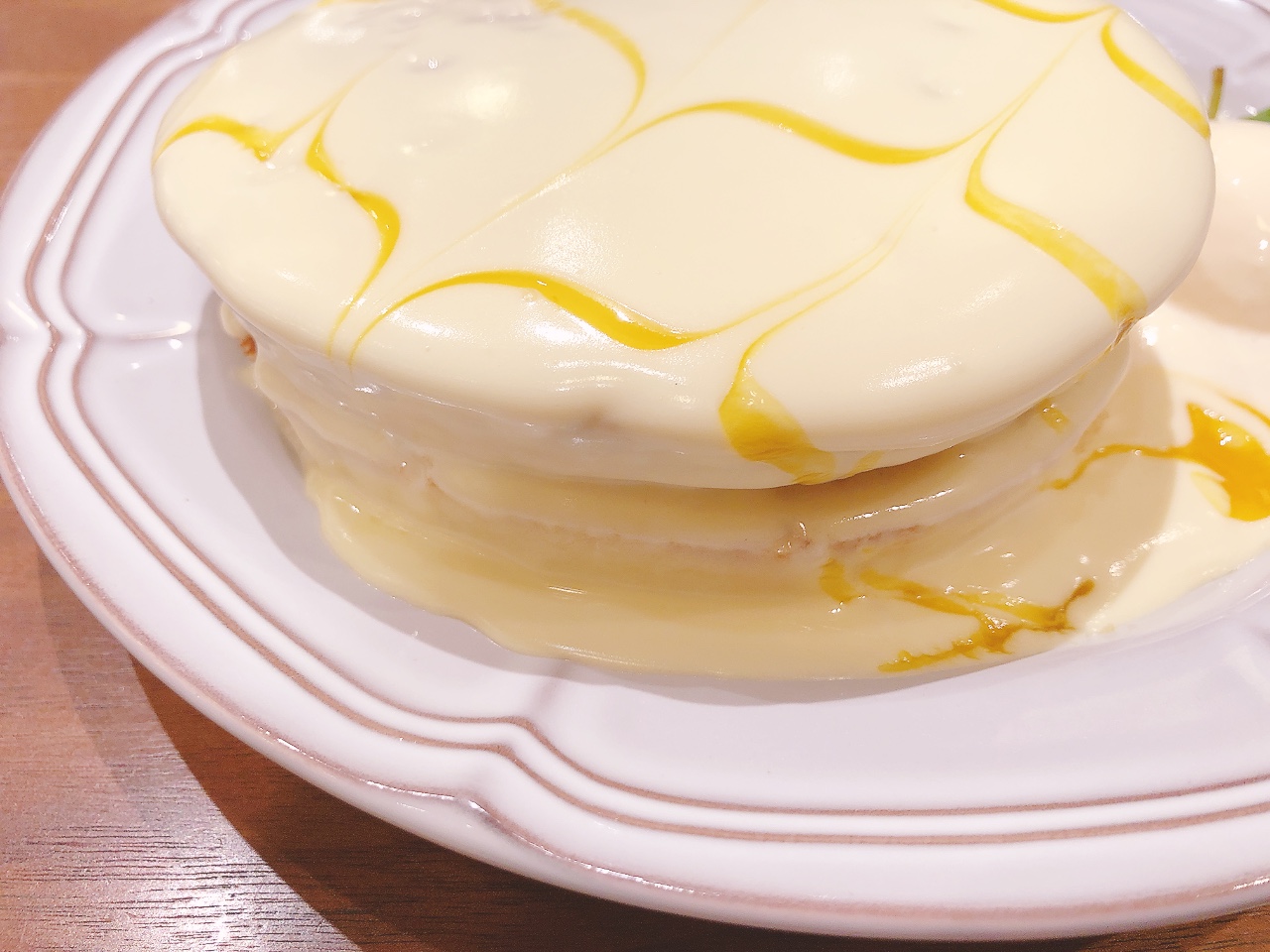 ホットケーキ全体を覆うレアチーズクリームは、軽やかで上品な甘さ。各店舗で丁寧に手作りすることで、口当たりの良いなめらかな舌触りを実現。さらにその上には、濃厚なアップルマンゴーソースをあしらい、華やかな見た目に。美しい模様のアップルマンゴーソースが、レアチーズクリームの爽やかさを一層引き立てる♡