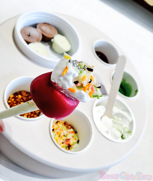 なんといっても、このピノフォンデュカフェの最大の楽しさは、自分で作れるだけでなく、チョココーティングされていない“ピノアイス”から、付けるソース、トッピングなどを友達とワイワイおしゃべりしながら選べちゃうところ。
