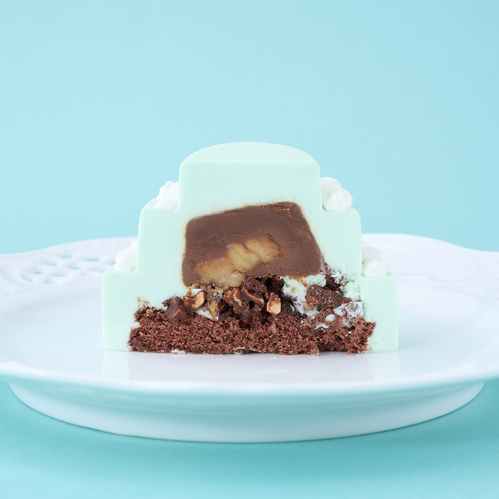 トウシューズのリボンのように可愛らしいリボンメレンゲが飾られた、優雅で華やかなバレリーナケーキプレートに、チョコミントフレーバーが登場!