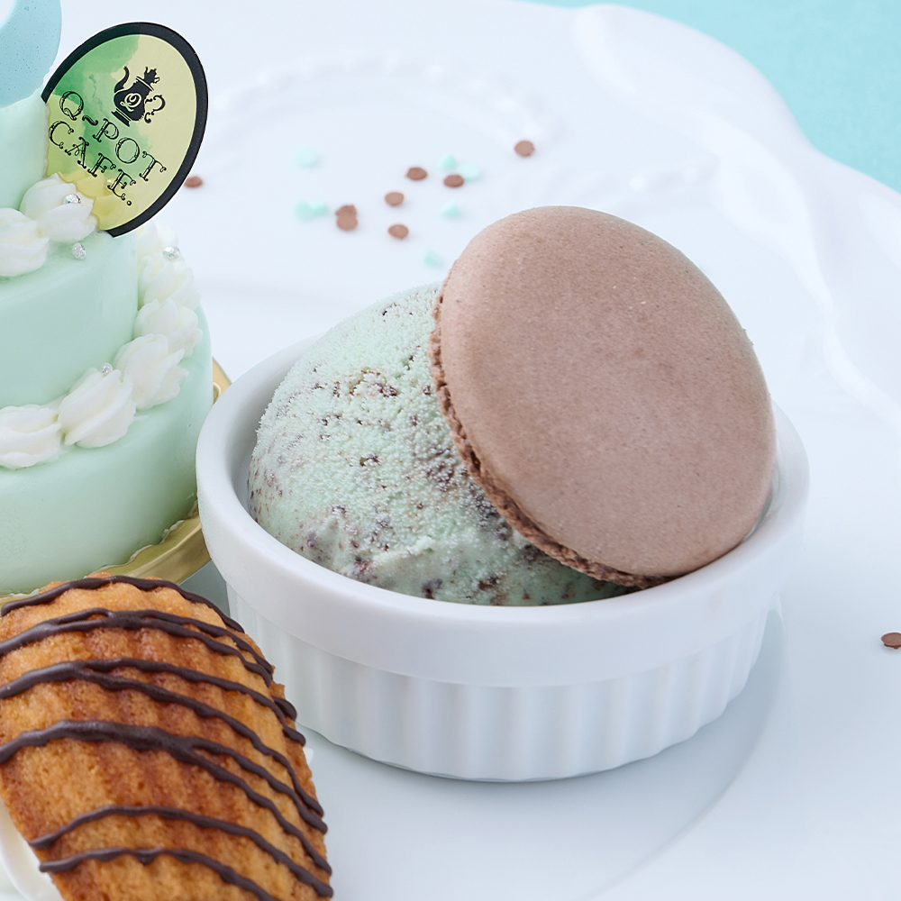 また、鮮やかなミントカラーのマカロンコックに、濃厚なチョコレートミントガナッシュクリームをサンドした「ミントチョコレートマカロン」がお取り寄せ&テイクアウト限定で発売決定!Q-pot CAFE.表参道本店にて6月2日(月)から発売。