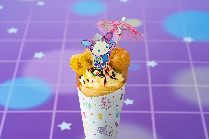 ナツマツリの定番であるチョコバナナ風な⾒た目の「ポムポムプリンの屋台の定番♪チョコバナナ風ミルクドリンク」など、様々なヤタイ風グルメが登場。