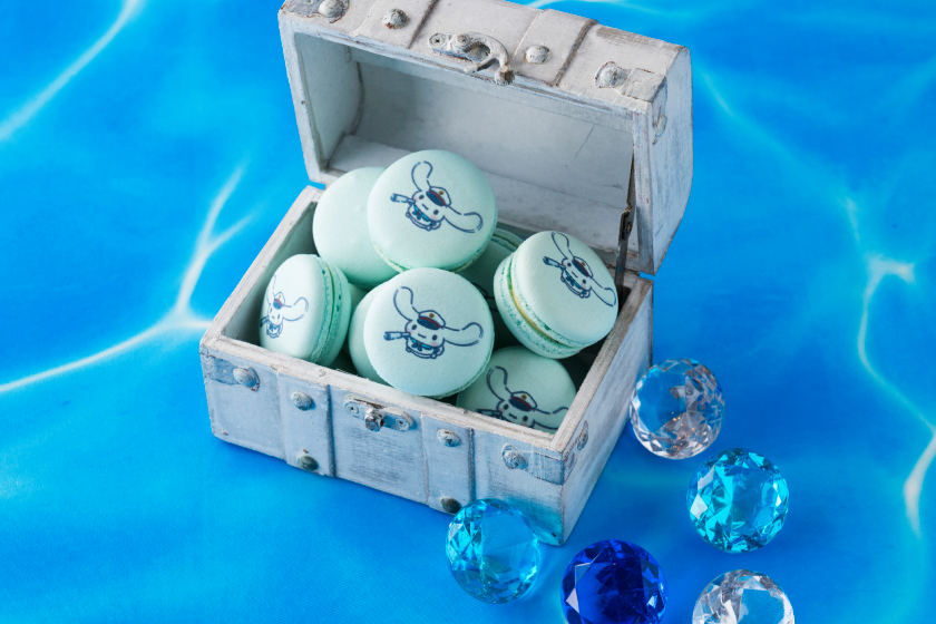 スモールポーションのスイーツも「シナモロール」のキャラクターより着想を得た愛らしいメニューを多数ご用意。ライムのホワイトチョコレートガナッシュをサンドした「トレジャーマカロン・シナモロールの大冒険」には、大きな耳をパタパタさせて空を飛びながら冒険を楽しむ“シナモン”が描かれているよ♡