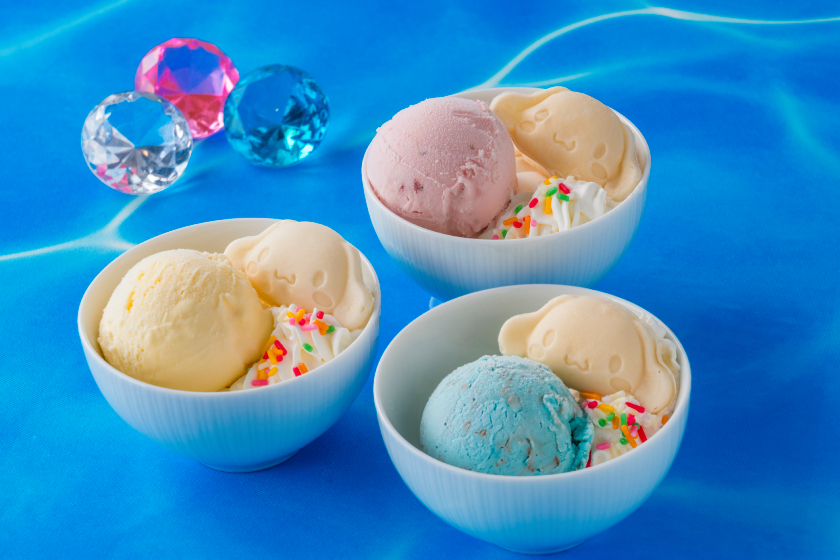 ライブステーションでも「シナモロール」の世界観を満喫できるよう、特製スイーツをご用意。バニラ、ストロベリー、チョコミントの3種類から好きなフレーバーを選び、シェフが目の前でホイップクリームと“シナモン”型の焼き菓子をトッピングする「“カフェ・シナモン”特製アイスクリーム」。