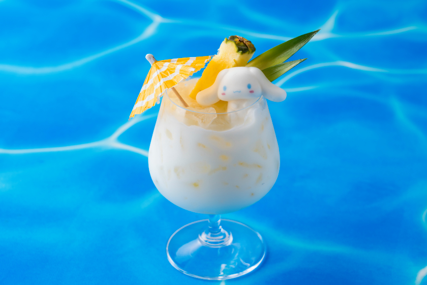 真っ白なパンナコッタにキラキラと透き通ったラムネゼリーを重ねた、涼しげな見た目の一品。サングラスを身に着けたお出かけ「シナモン」がキュートなグラススイーツ。