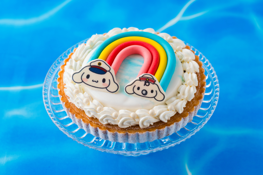 アーモンドが香るタルトに、ライチの果実とシロップを使用したクリーミーなムースをON。虹のふもとにちょこんと乗っている「シナモン」と「みるく」は、クルーズ船のキャプテンとクルーに扮しているよ。