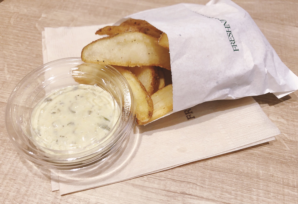 注文を受けてから作る揚げたてアツアツの北海道十勝産「北海こがね」の皮付きフライドポテト。本わさび茎のシャキシャキ食感とツンとした辛みが特徴のきざみわさび、コクのあるクリーミーな自家製タルタルソースを合わせたディップソースをたっぷりと付けて召し上がれ♪