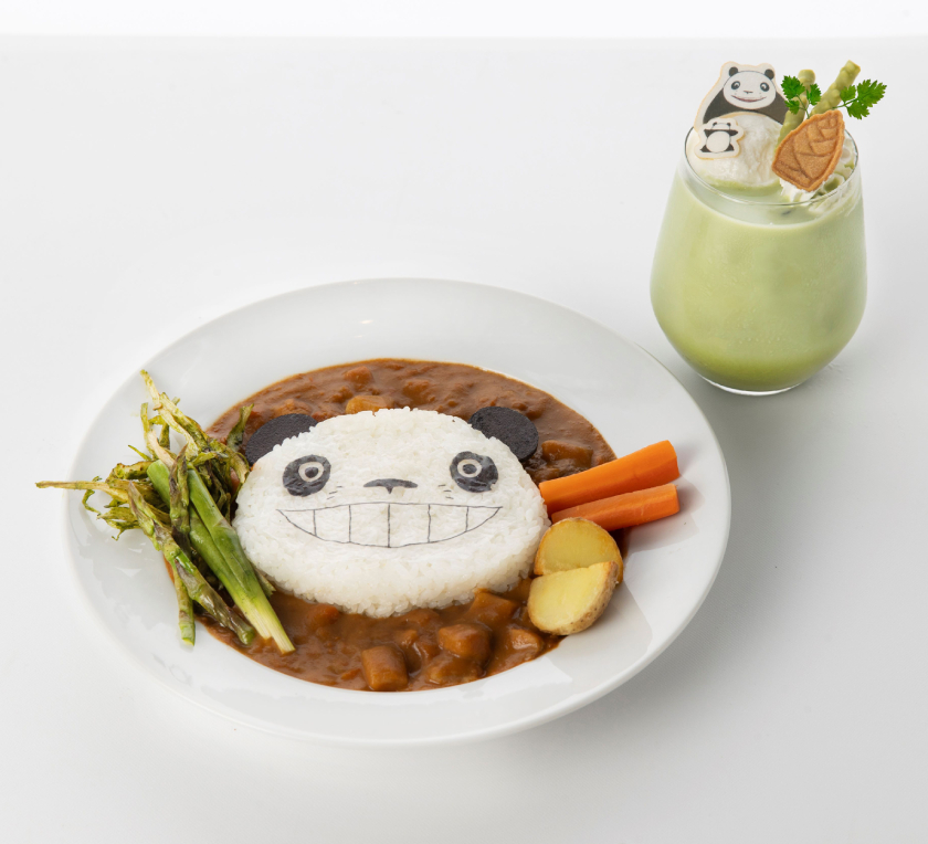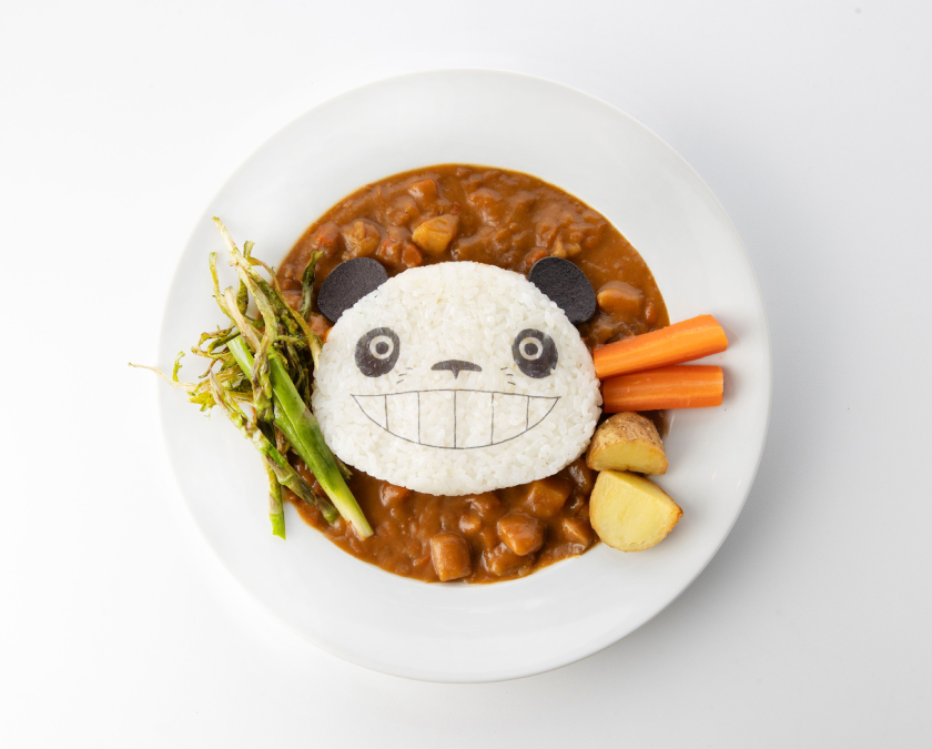パパンダの表情がインパクト大!パンちゃんでも食べられる甘口カレー。竹やぶをイメージして、アスパラや抹茶塩味の揚げゴボウを添えたよ。
